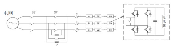 多電平儲能變流裝置的拓撲由并網(wǎng)電抗器、變流功率單元、電池、以及相應(yīng)的控制和保護設(shè)備構(gòu)成,裝置以1700V IGBT為核心,完全由無電池簇并聯(lián)的單簇電池組成,用變流器交流端串聯(lián)的辦法,星接或角接后直接接入3.3kV至35kV電壓等級母線。
